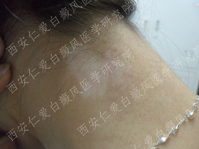 小梅是汉中一家大型超市的导购人员,本来后颈部位的白癜风是不被人重视的,但由于小梅工作需要把头发扎起来,所以白斑就表露在外,主管因此多次找小梅谈话,想要小梅换份工作,但因为小梅在超市也待了快20年了,别的也不会做,因此苦恼不已。更让小梅着急的是后颈的白斑越变越大,她怕这样发展下去会蔓延到脸部,所以找了很多家医院治疗,但效果一直都不明显,2012年4月3日小梅来到我院咨询治疗。